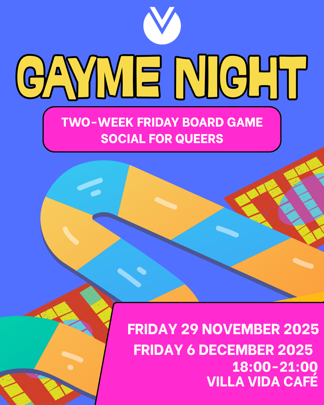 Your Friday Plans Just Leveled Up Gayme Night returns with a special two-week edition to close out the year with energy, community, and enough chaotic dice rolls to keep the universe entertained. Whether you're into strategy, speed, party chaos, or simply looking for a relaxed way to meet queer folks in Vienna, this event is built for you. Join us at Villa Vida Café on Friday, 29 November 2025, and Friday, 6 December 2025, from 18:00–21:00, for two consecutive evenings dedicated to connection and play. What to Expect This isn’t just a board game night — it’s a community-powered social hub. You’ll find a mix of classics, collaborative games, fast-paced fun, queer-friendly favourites, and a few surprise titles pulled from our community game library. Arrive solo or with friends. We onboard everyone quickly so no one sits awkwardly on the sidelines. Expect an easygoing atmosphere where conversation flows, laughter is frequent, and gameplay is as intense or as chill as you want it to be. Practical Details 📍 Venue: Villa Vida Café 📅 Dates: Friday, 29 November 2025 & Friday, 6 December 2025 ⏰ Time: 18:00–21:00 💛 All identities welcome. Drop-in friendly. No prior experience required. Whether you're here for the gameplay, the vibe, or to expand your queer social graph, Gayme Night is your weekly reset button. Come for one Friday — or double down and join both weeks. Either way, you’ll leave with new connections and a refreshed sense of community.