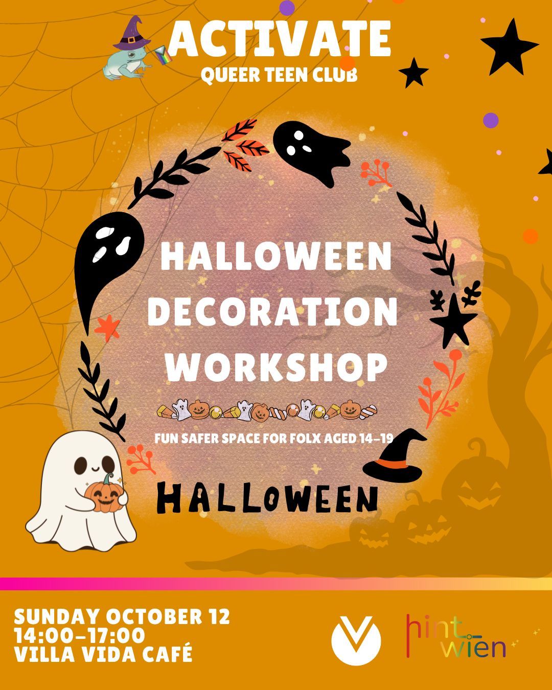 *free workshop-all materials included* Let your spoooooky creativity shine on Sunday, October 12th at 14:00 at Villa Vida Café as we craft our own Halloween decorations to get ready for the gayest holiday of the year. We will also set up a pumpkin painting station where you can create the most BOO-tiful pumpkin ever 🎃 So come join this Halloween decoration party, and connect with fellow teens in a safe and welcoming space! It’s not scary at all!! 🙀