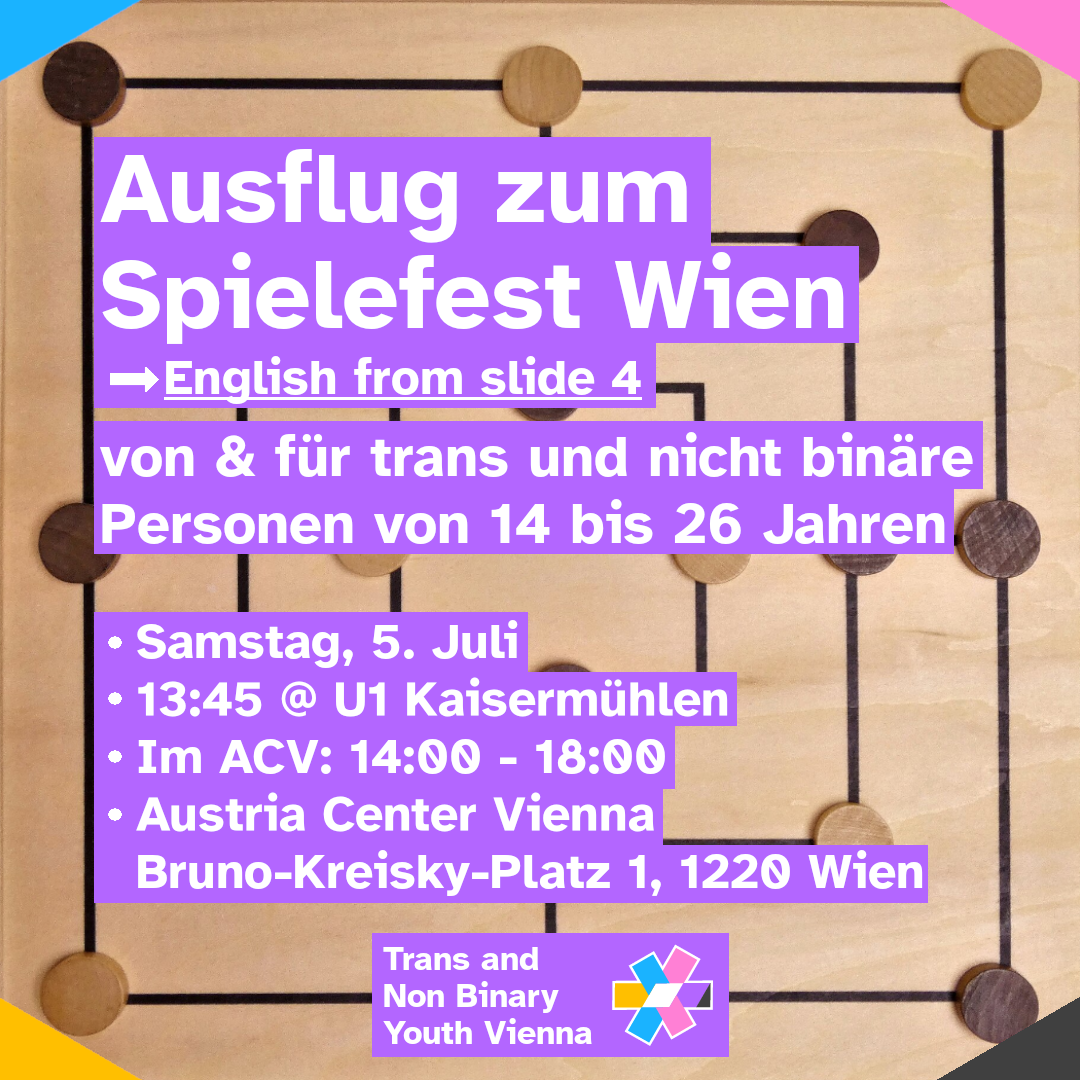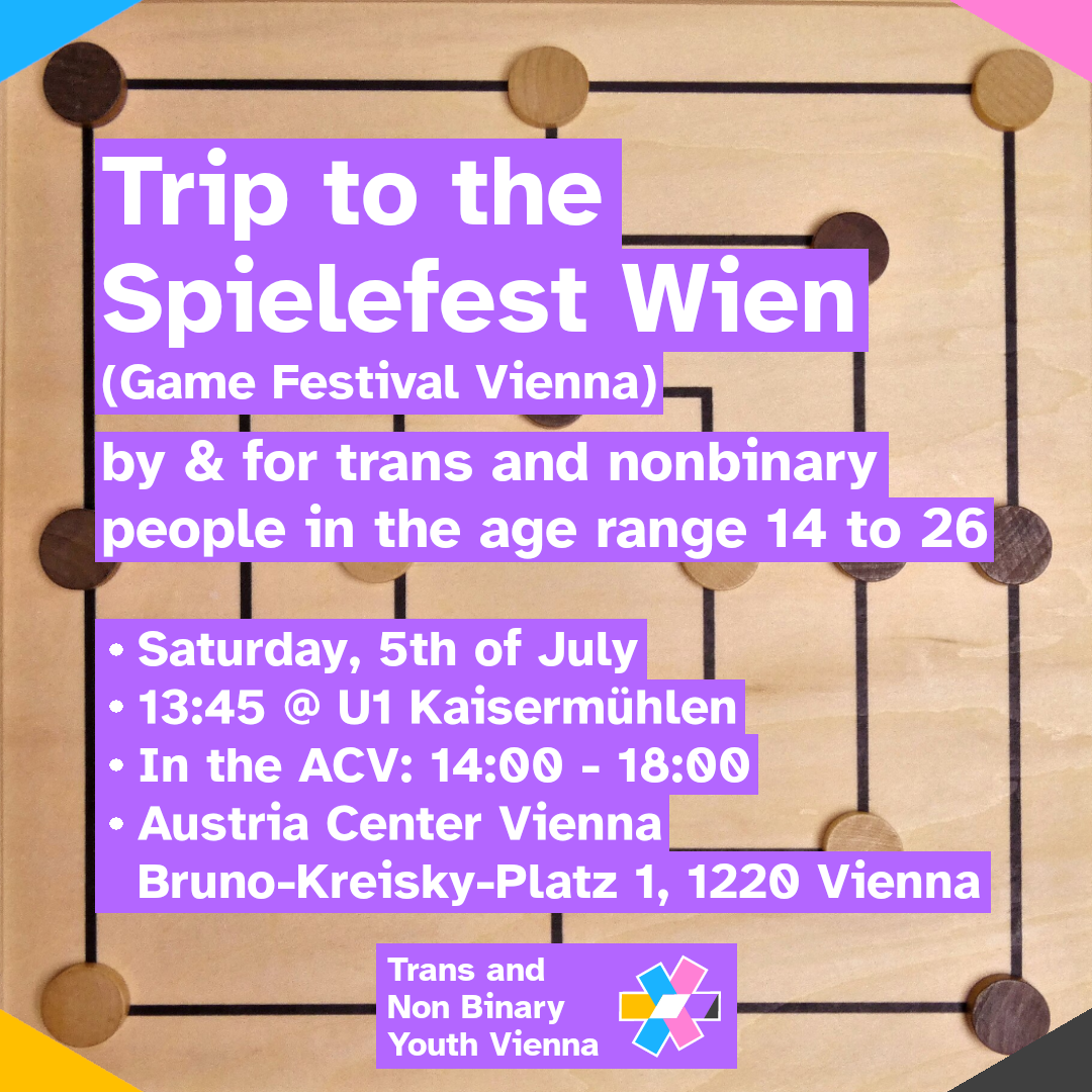 Kommt mit uns zum Spielefest Wien! Dort könnt ihr euch kostenlos Spiele ausborgen und Vorort spielen, seien es Karten- oder Tabletop Spiele. Für Fans von digitalen Spielen gibt es den E-Sport & Gaming Bereich mit allen möglichen Spielen und Turniermöglichkeiten. Datum: 5. Juli Uhrzeit: 13:45 Treffpunkt: U1 Kaisermühlen Falls ihr mitkommen möchtet, kauft euch möglichst bald ein Ticket, da sie wahrscheinlich schnell ausverkauft sind! Wir freuen uns schon auf euch! ++ english version ++ Join us on our trip to the Spielefest Wien (Game Festival Vienna)! You can try different card- and tabletop games, by borrowing games and playing them at rhe festival. For fans of digital games, there is an e-sport & gaming area with a variety of games & competitions to watch or take part in. Date: 5th of July Time: 13:45 Meeting point: U1 Kaisermühlen If you want to join us, we recommend you buy a ticket soon, as these might be sold out faster than we know! We look forward to going there with you!