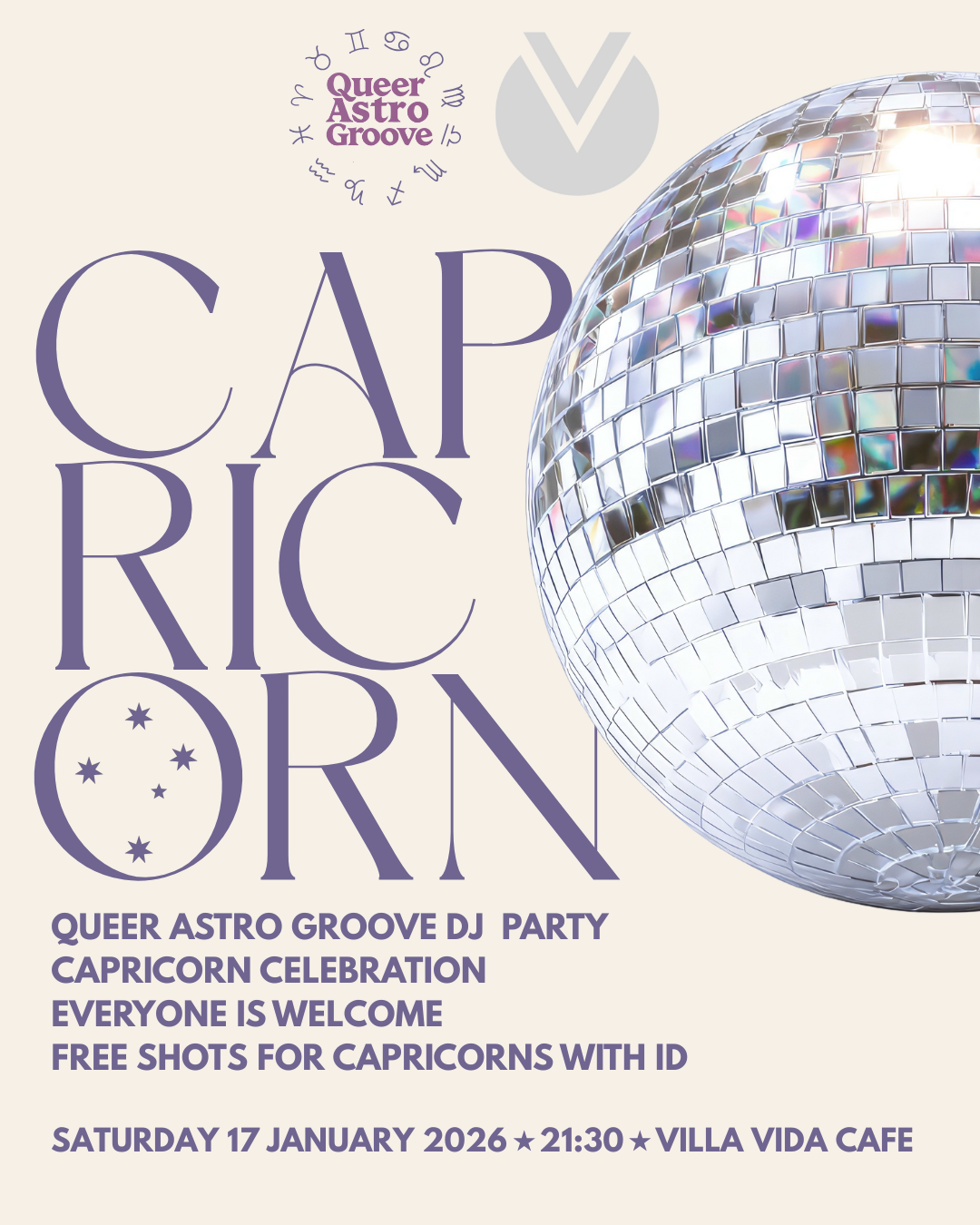 apricorn season is here, and we’re celebrating in style. Join us for a high-energy Queer Astro Groove DJ Party dedicated to all the ambitious, iconic, no-nonsense Capricorns out there — and everyone who loves them. Whether you’re a Capricorn or just here for the dance floor, this night is about good music, queer joy, and letting loose together. Expect disco vibes, cosmic energy, and a crowd that knows how to groove. ✨ Free shots for Capricorns (with ID) If you’re a Capricorn, flash your ID at the bar and enjoy a free shot on us. It’s your season — you deserve it. 🌈 Everyone is welcome This is an open, inclusive party for all identities. Come solo, bring your crew, or meet new people on the dance floor. The vibe is friendly, playful, and very gay. 🎧 Music Our DJ will be serving dancefloor bangers, disco grooves, and party classics to keep you moving all night long. ♒ About Queer Astro Groove Queer Astro Groove is a zodiac-themed party series celebrating each sign with music, community, and cosmic chaos. Each month we honor a new sign — this time, it’s Capricorn energy all the way. ♿ Accessibility Villa Vida Café is fully wheelchair accessible and has an accessible toilet. 💜 Safer Space We aim to create a respectful, safer space for queer community. Discrimination, harassment, or bad vibes are not welcome. Come as you are. 🔮 Why you should come • You love astrology • You’re a Capricorn and want free shots • You need a queer dance floor • You want to meet cute people • You simply love a good party