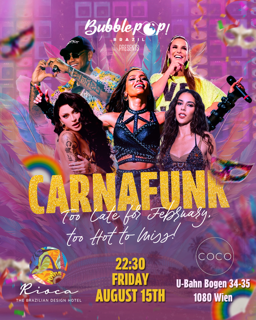 ๐ซง๐ง๐ท BUBBLEPOP! BRAZIL - CARNAFUNK ๐ซง๐ง๐ท ๐ You're Invited to CarnaFunk โ The Hottest Queer Carnival of the Summer! ๐ Get ready, Vienna! This August, weโre bringing the heat, the beats, and the brazilian funk to the heart of Europe with CarnaFunk โ a bold, vibrant celebration of queer joy, diversity, and the electrifying energy of Brazilian carnival. Join us for a night where music, dance, freedom, and fabulousness take center stage. From pulsing funk rhythms to dazzling carnival vibes, CarnaFunk is all about embracing who you are and living out loud. ๐ณ๏ธโ๐๐ฅ Expect: ๐ Brazilian funk + tropical beats ๐ A safe, inclusive space for the queer community and allies ๐ญ Carnival-inspired looks, glitter, feathers, and unapologetic self-expression ๐น Summer cocktails and party vibes all night long ๐ Vienna, Austria ๐ FRIDAY, August 15th โฐ 22:30 ๐๏ธ Everyone is welcome โ come as you are or as your wildest self! Letโs make this summer unforgettable. Bring your pride, your funk, and your fiercest look โ the CarnaFunk stage is waiting for you!