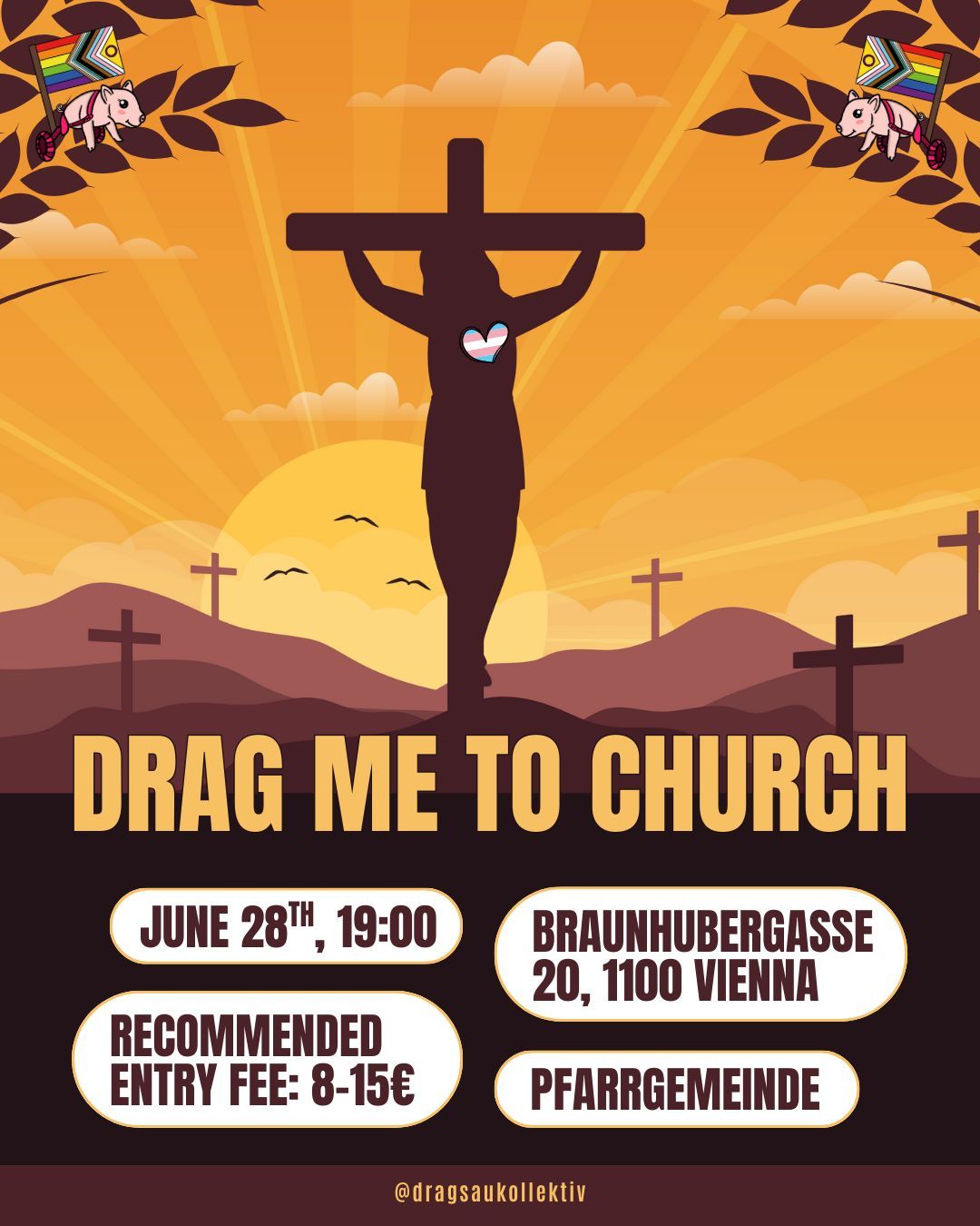 Get ready this pride month because we are dragging you to (accessible) church! 🔔 Under the motto: “Drag me to Church” our first PRIDE show is going to be a ceremony of love, art, and accessibility! 🌈 We cannot wait to invite you to this queer mass, worshipping the godesses, gods and deities of drag. 🐷Where? Evangelische Pfarrgemeinde Simmering, Braunhubergasse 1110 Wien 🐷When? 28.06: 7pm (entry), 8pm (show) 🐷Entry is on a solidarity basis, recommended entry is 8-15€ So bring your friends, lovers, family, siblings and lots of riot energy and disabled joy for this year’s pride month to our show because this service is going to be unapologetically queer, political and anti-ableist! The lineup and our collective are ready to serve some cunt at the altar. And of course, you do not have to be religious to attend - our subject of worship is the art of drag ✨️ Don’t forget to bring cash and tip your performers!