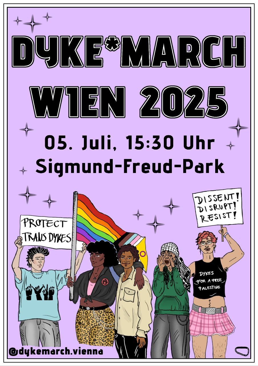 Hello to all dykes and our friends! we are DYKE*MARCH VIENNA and we are angry about fascist hate, and that it keeps growing. We are tired of neoliberal pinkwashed Pride events that exhaust us and leave us feeling like queerness has been sold. We want justice, even after Pride Month. That’s why we want to gather on the 5th July, take to the streets, take up public space and be loud for political queerness together! When we think of dykes we think of not only lesbians, but also of trans and non-binary people, femmes and butches, bi- pan- and asexual queers, everyone inbetween and still figuring it out - most of all, we think of a common political understanding. We want to march with everyone who understands queerness in an intersectional, anticapitalist and antiracist way. If you want this, too, come to DYKE*MARCH VIENNA on the 5th of July at 3.30 pm to Sigmund-Freud-Park!