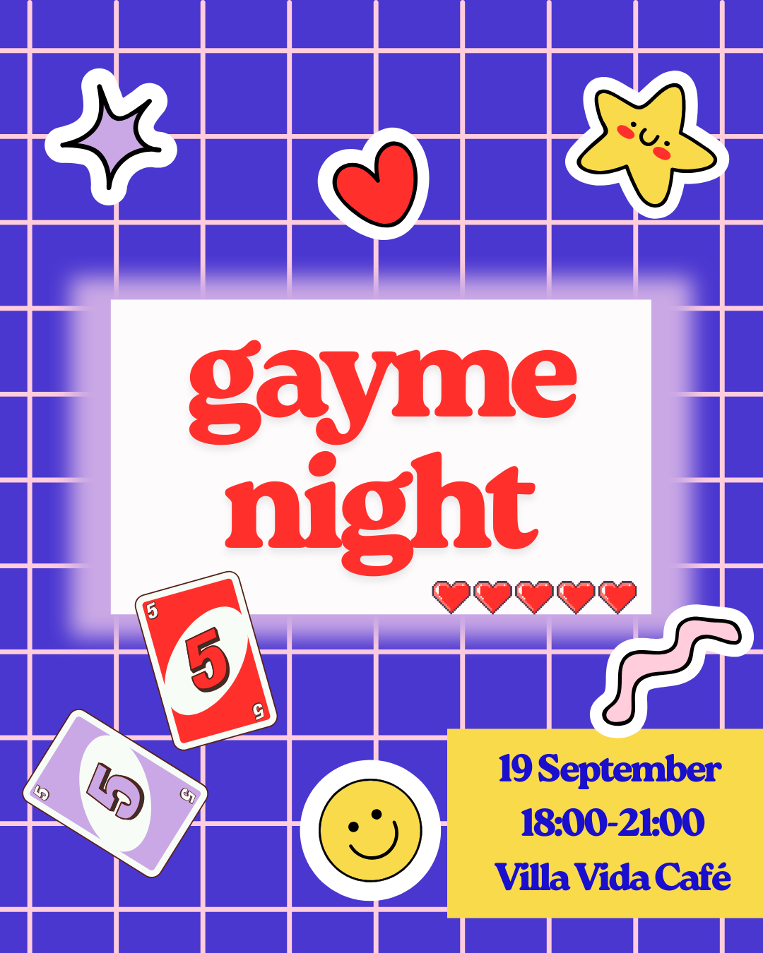 Play, Laugh, Connect–It’s Gayme Night! Join us on Friday, September 19 for Gayme Night–a cozy evening of queer joy, friendly competition, and board game fun at Villa Vida Café! Whether you’re a seasoned gamer or just here to roll some dice and make new friends, this night is for you. Bring your own game, or just bring yourself–we’ll have a fun mix of classics and queer favorites ready to go. 🃏♟️🎯 What to Expect at Gayme Night 🎲 Games Galore–Enjoy a rotating mix of easy-to-learn card games, strategic board games, and party games (Uno, Strategy, Dixit, and more). Meet New People – A friendly, inclusive space to connect and laugh with fellow queers. ☕ Chill Café Atmosphere – Drinks, snacks, and good vibes in a relaxed community setting. 🗨️ Language: Mostly English, but multilingual guests welcome! Whether you’re deeply competitive or just in it for the vibes, Gayme Night is the perfect low-pressure evening to unwind, play, and connect.