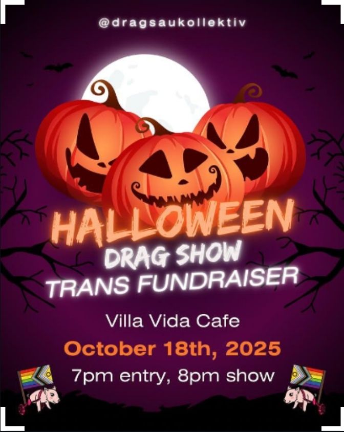 We are emerging from our accessible graves and peaceful slumber to bring to you a spooky special you'll never forget: Dragsau's first Halloween show! And because nothing is spookier than transphobia and trans exclusion, we are teaming up with Trans and Nonbinary Youth Vienna this time for a fundraising event! That's right girls and ghouls: This Dragsau show we are raising money for a trans* youth space in Vienna! So bring some cash, your queer and disabled cute self (allies welcome !), a cute costume if you want to and the spooky festive spirit for this October cause we have a lineup full of hauntingly beautiful divas and monsters for the crucial cause of Protecting Trans Youth. When: Saturday, October 18th, 7pm (entry) / 8pm (show) Where: Villa Vida Café, Linke Wienzeile 102 1060 Wien How much: recommended entry is 8-15€ also bring cash for the fundraiser to help out TNYV! Don't forget to bring cash for a good cause (and don't forget your Halloween spirit!). Accessibility info and lineup coming soon! XO, The Dragsau collective
