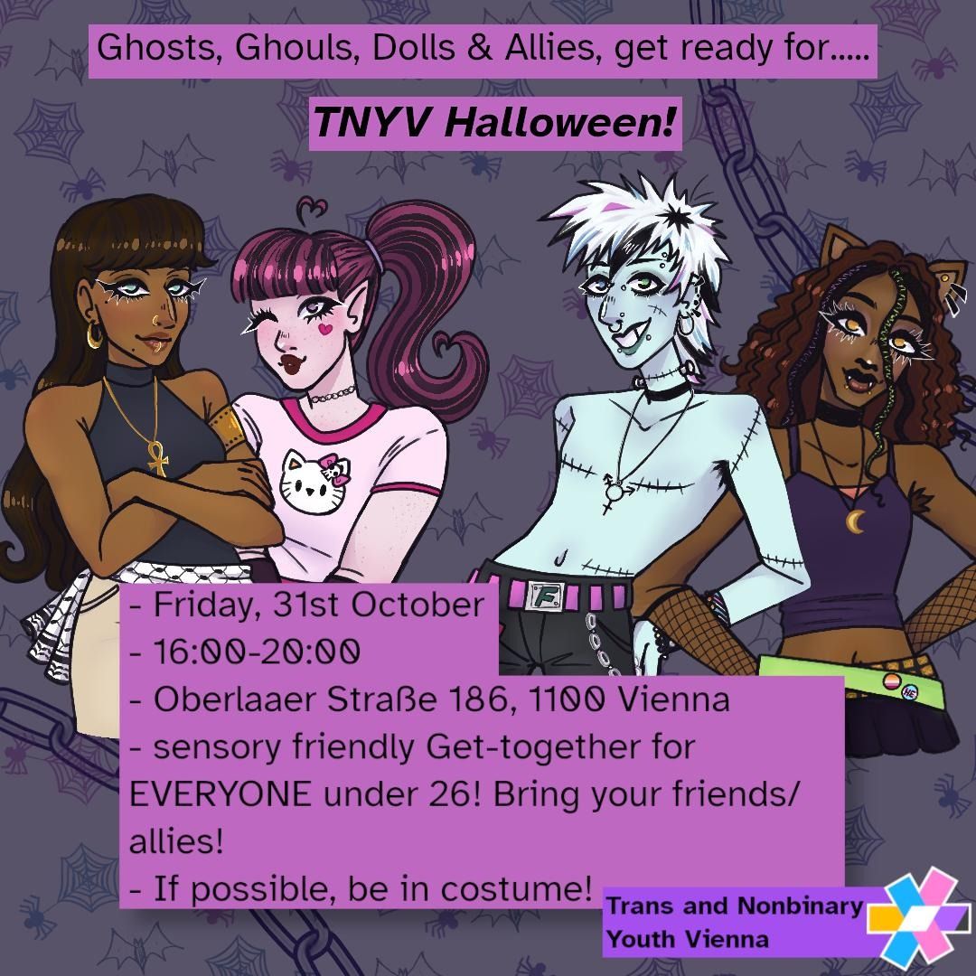 Attention ghosts, ghouls, dolls, and allies! Trans* and nonbinary youth are celebrating Halloween, and you're all warmly invited! And by everyone, we also mean that cis friends and allies under 26 are warmly welcome! On October 31st, from 4 p.m. to 8 p.m., we invite you to a party with games, tabletop RPGs, a voluntary costume contest, crafts, and plenty of (vegan) food! There will also be a relaxation room for anyone who needs it. We'd also love for you to dress up and bring homemade food! The party will take place at Oberlaaer Straße 186 (where the "Kindergruppe Regenbogen" (rainbow children's group) is usually located)! You can reach us by taking the U1 (Neulaa station + 10-minute walk), bus 17A (Weidelstraße station), or lines 17A, 67A, or 67B (Himberger Straße station + 5-minute walk). The party will be sensory-calmed and drug-free: This means there will be no loud music and no drugs (including alcohol)! Bringing and consuming drugs and alcohol will also not be tolerated. If you must smoke, we ask that you do so outside and respect those around you. We also do not tolerate any form of discrimination and ask you to treat your surroundings and fellow human beings with care. To all cis people: Please be aware that this party is still a safe space for trans* and nonbinary people, and you are also contributing to that! Don't make yourself the center of attention and respect everyone! We are incredibly excited to celebrate this spooky evening with you! Admission is free, of course – come as you are and stay as long as you want 😊