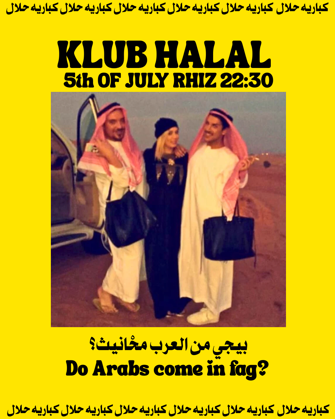 Welcome to KLUB HALAL X KUKII DO ARABS COME IN FAG? I guess we will see. This Klub Halal edition we are hosting KUKII, formerly known as Lafawndah, Kukii is a singer, composer, producer, and creative director of Egyptian & Iranian, descent She debuted under the moniker KUKII in mid‑2024, fully embracing her connection to Cairo—and her new sound—for the 2025 launch of her debut EP Rare Baby. The title track “Rare Baby” is a fusion of Egyptian mahraganat rhythms, 90s post‑punk energy, and Middle Eastern instrumentation—an eclectic anthem filmed in Cairo that reflects her roots and artistic evolution EVENT DETAILS 📅 Saturday, July 5th | ⏰ 22:30 until sunrise 📍 RHIZ U-Bahnbogen 37, 1080 Wien FEATURED ARTISTS KUKII (EGYPT / IRAN) https://youtu.be/99EQ0s5P7l8?si=0QG4oZugS57CmTMn YALATIF (Tunisia) https://www.instagram.com/oooyalatifooo?igsh=emFxbWd6OGo0NHVp ON THE DECKS 🎧 Sanadrilla (Jordan/Palestine) – Our resident DJ, spinning gay Arab pop anthems 🎧 TOQA (EGYPT) - Spinning Egyptian mahrganat legacy TICKETS & ENTRY 🎟 Contribution – Tickets are a contribution to help bring this unforgettable event to life. Your contribution ensures that we can provide an incredible experience with top-tier sound, lighting, and iconic Arab talents. While we encourage everyone to support, your contribution is essential for entry. 🔴 Awareness Team “ Easily identifiable by their strip lights, our team is here to ensure a safe(r) space for everyone. ♿️ Fully Wheelchair Accessible – The venue is designed to accommodate all guests, ensuring a comfortable and inclusive experience. PHOTO & VIDEO POLICY 📸 🚫 NO PHOTO OR VIDEO IS ALLOWED INSIDE THE VENUE, our photographer will take shots without faces shown. However, filming is allowed during stage performances only. HOUSE RULES – RESPECT & SAFETY FIRST ✅ DO: ✔ Respect personal space and boundaries. ✔ Celebrate diverse expressions of gender & sexuality. ✔ Dance, love, and support each other. 🚫 DO NOT: ❌ Engage in racism, homophobia, transphobia, antisemitism, Islamophobia, sexism, ableism, ageism, body shaming, bullying, or harassment. ❌ Touch anyone without explicit consent. ❌ Get visibly intoxicated – You may be asked to leave without refund. 🔴 Management reserves the right to deny entry or remove individuals who violate these rules. 🔴 Having a ticket won't guarantee your entry as door selection applies, in case you were denied entry your ticket will be refunded in 3-6 business days COMMUNITY SUPPORT 💜 If you cannot afford the ticket contribution, please contact us for our community-supported reduced tickets. 🔥 Let’s come together to celebrate our identities, culture, and unity. See you on the dance floor! 🔥