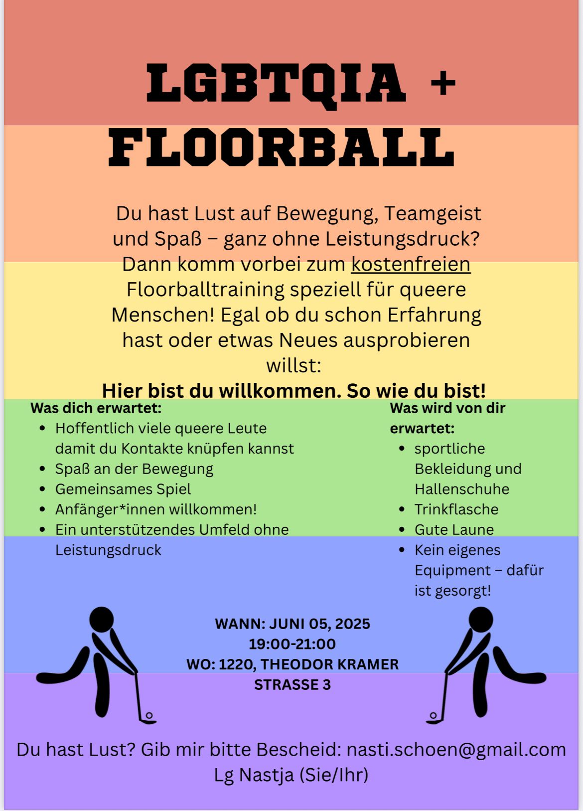 Hey everyone! I’m an occupational therapy student, and that inspired me to create my own training experience. To make this happen, I combined two things I love the most: on the one hand, floorball (a sport played with sticks and small plastic balls), and on the other, the LGBTQIA+ community. My goal is to create a safe space in sports where people can participate in physical activity without fear of judgment, build connections, and hopefully make new friends. If you enjoy being active or just want to have a good time, come join us! If you have any questions or would like to join, you can reach me at: nasti.schoen@gmail.com I’m looking forward to meeting you all! Hallo zusammen! Ich studiere Ergotherapie, und das hat mich dazu inspiriert, mein eigenes Trainingsangebot auf die Beine zu stellen. Dafür habe ich zwei Dinge kombiniert, die ich besonders liebe: Zum einen Floorball (eine Sportart, die mit Schlägern und kleinen Plastikbällen gespielt wird), und zum anderen die LGBTQIA+ Community. Mein Ziel ist es, einen sicheren Raum im Sport zu schaffen – einen Ort, an dem alle ohne Angst vor Bewertung aktiv sein, Kontakte knüpfen und hoffentlich Freundschaften schließen können. Wenn du Lust hast, dich zu bewegen oder einfach nur eine gute Zeit haben möchtest, komm gerne vorbei! Bei Fragen oder wenn du mitmachen willst, erreichst du mich unter: Ich freue mich darauf, euch alle kennenzulernen!