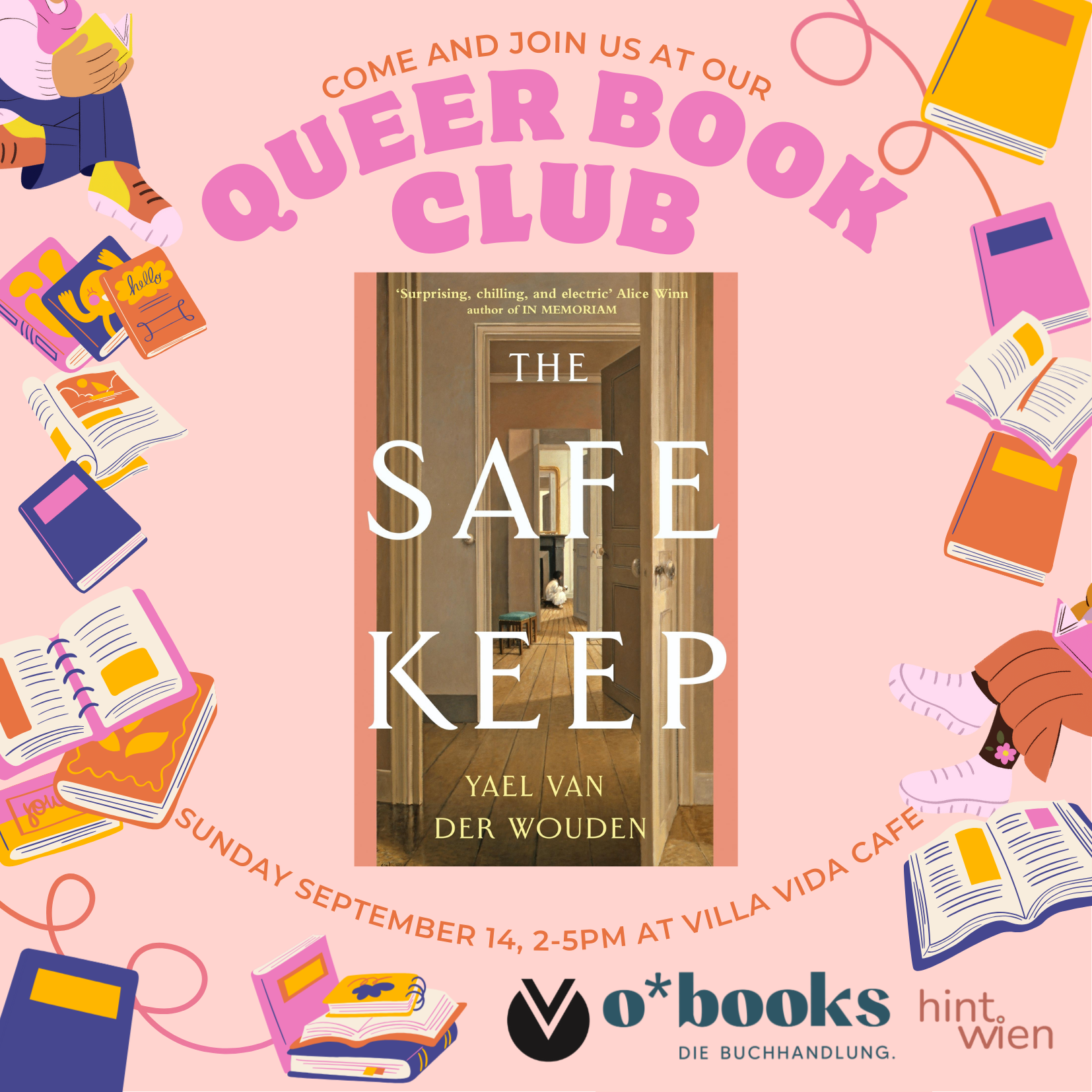 📖 Join the Queer Book Club Vienna in September Our monthly Queer Book Club is back at Villa Vida Café (every second Sunday of each month), and this time we're diving into The Safe Keep by Yael van der Wouden. This gripping debut novel mixes dark secrets, queer longing, and post-war tension into a page-turning experience. As always, this event is hosted in collaboration with o*books and hint.wien. ✨ About the Book: The Safe Keep Set in the Netherlands just after WWII, The Safe Keep follows Isabelle, a woman living a quiet, solitary life until her late father's former student, Eva, arrives on her doorstep. As Eva stays longer, tensions rise, and secrets unravel in a story that combines the gothic with the sensual. This novel has been praised for its atmosphere, intensity, and intimate portrayal of queer desire in a repressive time. Expect a discussion that covers power, intimacy, memory, and queer visibility—with plenty of room for your own reflections. 🌟 Event Details Date: Sunday, September 14 Time: 14:00–17:00 Location: Villa Vida Café, Vienna Language: English (the book is also available in German translation) 📖 What to Expect An open, casual discussion about the book—even if you haven’t finished it! Time to mingle, connect, and enjoy a cozy afternoon in good company Coffee, drinks, and cake available from the café-bringing your own drinks and snacks to share is welcome! 🌐 How to Join No registration required—just show up! All you need is curiosity and a willingness to engage. Copies of The Safe Keep are available through our partner bookstore o*books. You can send us an email to join the Whatsapp group at villavidavienna@gmail.com. ⚡ Trigger Warnings The novel includes themes of abuse, emotional manipulation, and war trauma. Please take care of yourself while reading and feel free to join the discussion even if you had to pause.