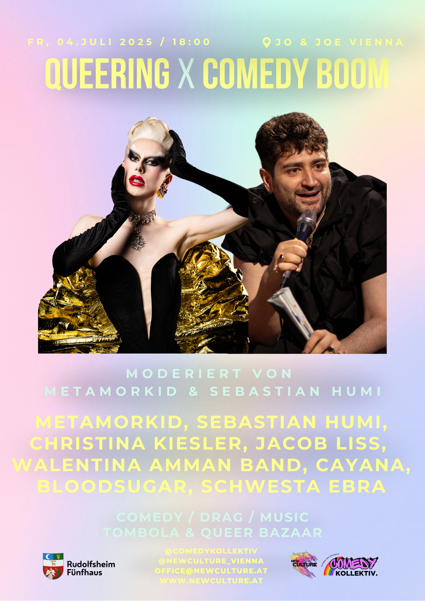 Queering meets Comedy Boom - a night full of Comedy, Drag and Music, hosted by Metamorkid and Sebastian Humi! Enjoy the show, our queer bazaar with local art and handcraft or win in our tombola. Entry is free and everyone is welcome!