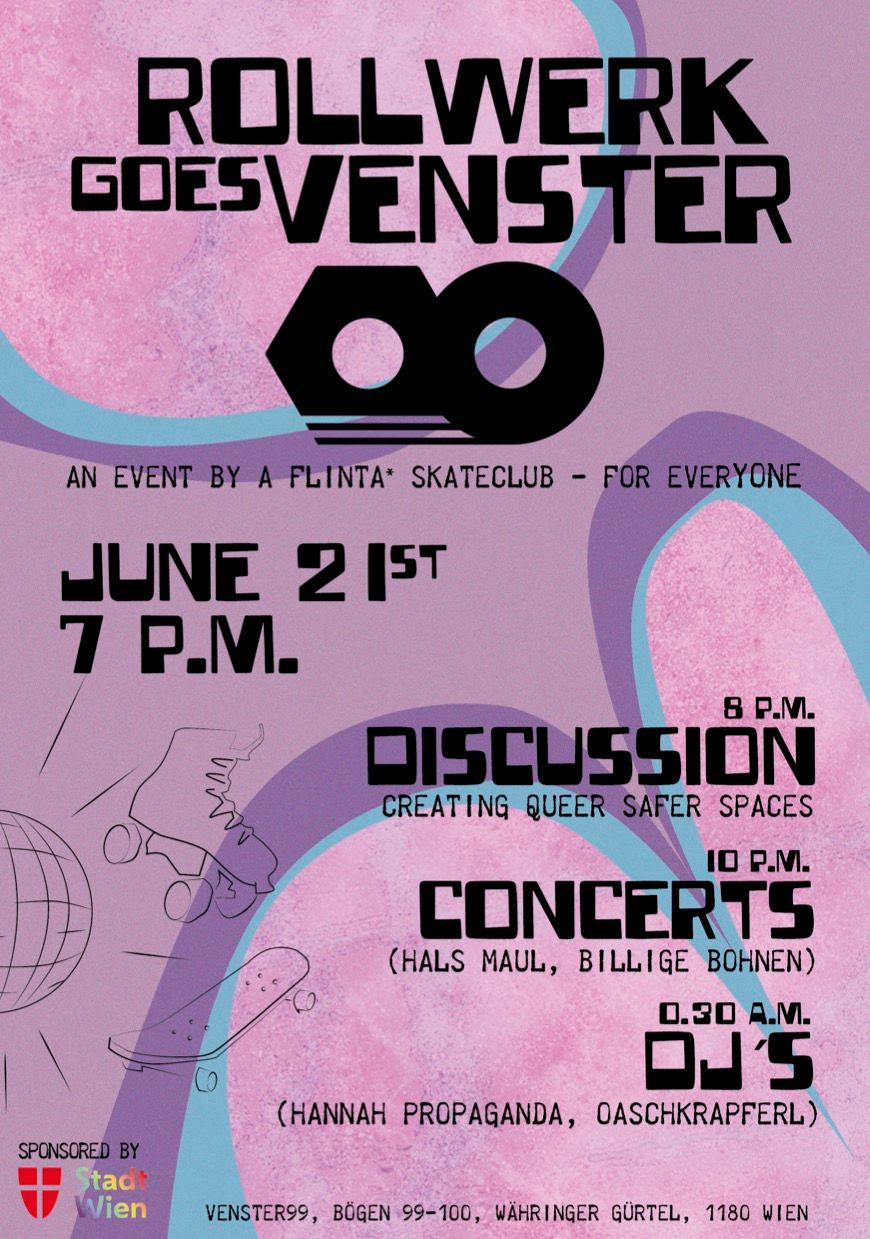 We are hosting an event at Venster99 on June 21st! There is going to be a panel talk on how to create queer safe(r) spaces. We will have some great representative speakers from different sports and/or flinta* institutions on stage. After that we will have a good time with two amazing live bands and DJ sets! Also, we will have a nail artist at the event with some sick designs💅💅💅 All revenue will be collected for the Rollwerk Verein. Time table: 19h – Open Doors 20h – Panel talk 22h – Concerts 0:30h – DJ Sets