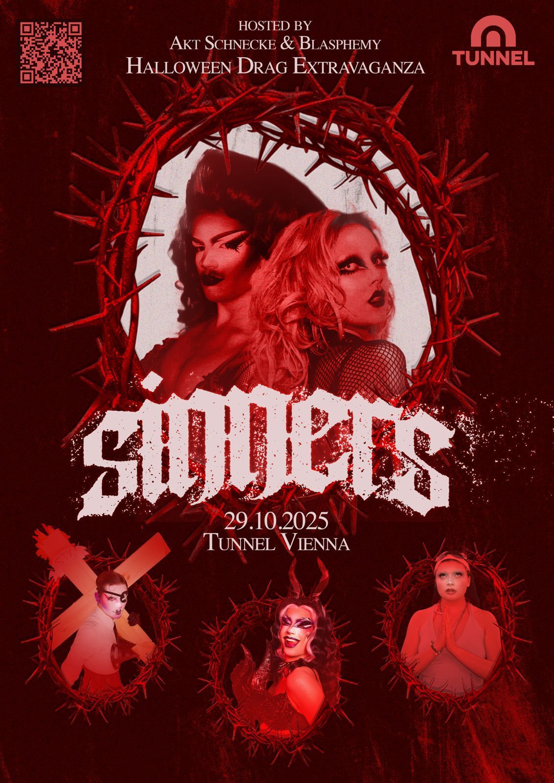 SINNERS Folge deinen höllischen Gastgeber*innen Blasphemy & Akt Schnecke auf ihrer Reise durch die neun Kreise der Hölle. Dich erwarten neun dämonisch glamouröse Performances, inspiriert von Dantes Inferno, mit sündhaften Gast-Auftritten von XTZ, Bloodsugar XO und Juicy Buttler. Tunnel Vienna, Florianigasse 39, 1080 Wien Einlass: 20:00 | Showstart: 20:30 Vorverkauf: 13,12 € | Abendkassa: 15 € Zieh dich sündhaft an, beschwöre deine inneren Dämonen und erlebe eine Nacht voller Sünde, Drag und Spektakel, heißer als die Hölle selbst. ____________ SINNERS Follow your devilish hostesses Blasphemy & Akt Schnecke as they guide you through the Nine Circles of Hell. Experience nine gory, glamorous performances inspired by Dante’s Inferno, featuring sinful appearances by XTZ, Bloodsugar XO and Juicy Buttler. Tunnel Vienna, Florianigasse 39, 1080 Vienna Doors: 20:00 | Show: 20:30 Presale: €13.12 | At the door: €15 Dress to sin, summon your inner demon, and prepare for a night of drag, spectacle, and damnation hotter than hell itself.