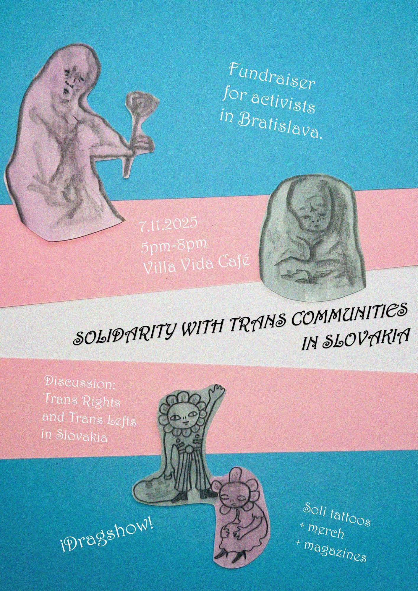 Discussion · Drag Show · Soli Tattoos Trans communities in Slovakia have been decimated and debilitated for decades. Current fascist government of Slovakia has recently changed the constitution, making its law sovereign above international law. The new constitution also speaks of only “two biologically predetermined genders.” The threat to the lives and rights of trans people is immense. We want to come together on the 7th of November to show solidarity with trans activists and communities fighting against the Slovak regime. The recent constitutional changes by the fascist Slovak government attempt to erase our identities and strip away basic rights. But we know that trans liberation is not bound by borders. Instead of the nation state, we build transregional solidarity. 🗣 Panel Talk Join writer/organizer Sabrina Katonoff and activist Lucas Lee for a discussion on the current state of trans rights and leftist resistance in Slovakia. 🎭 Drag Show + Soli Tattoos After the discussion, enjoy a drag performance and get a solidarity tattoo or browse our merch/magazine stand. 💜 This event is a fundraiser to support trans activists and grassroots movements in Bratislava. They can take away our rights, but they can never take away our love.
