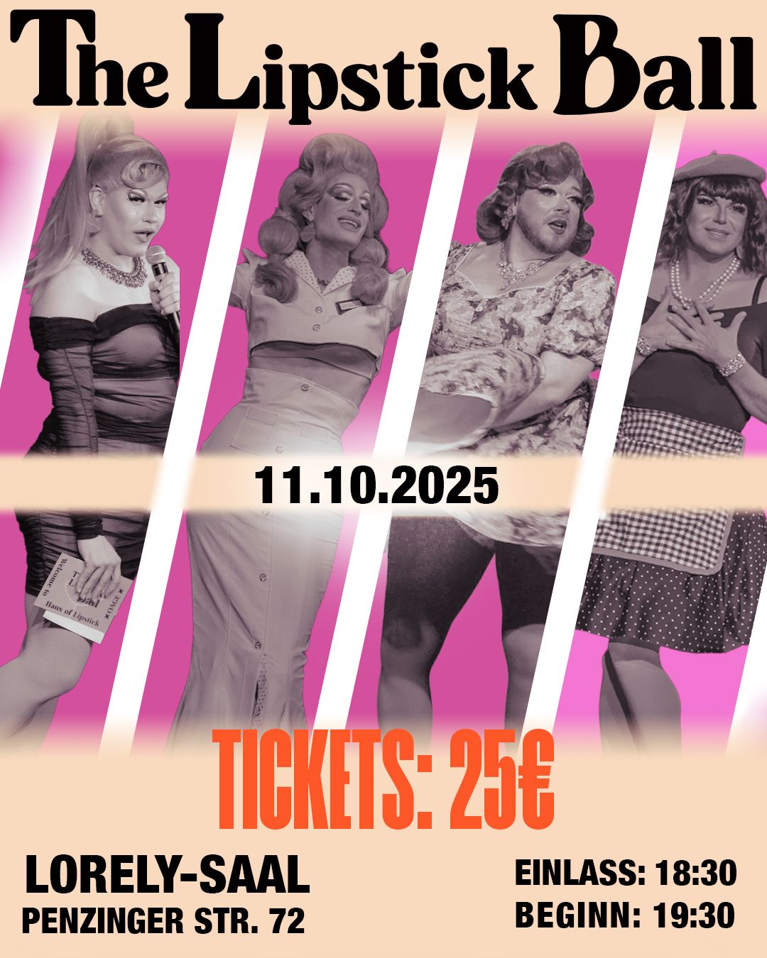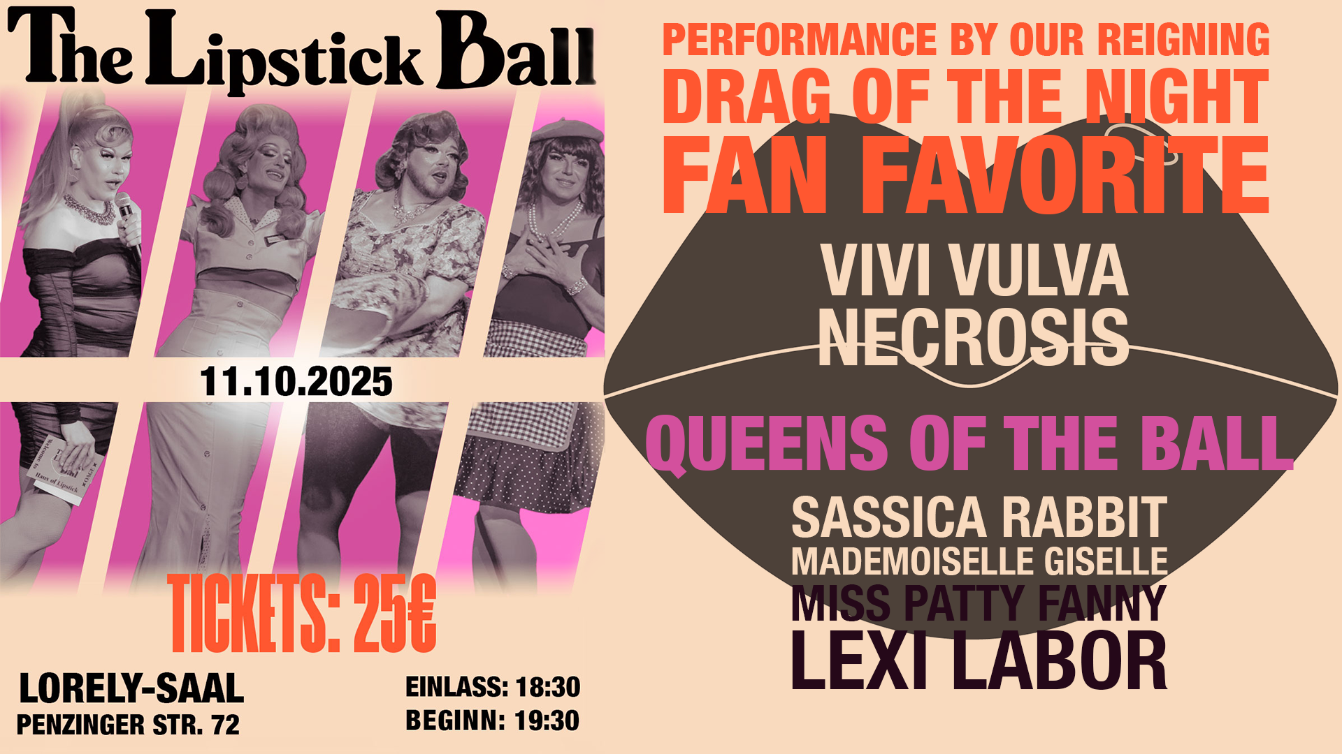 Ticket-Alarma! Ticket-Alarma! Ticket-Alarma! Es ist soweit der Lipstick Ball ist zurĂŒck und ihr könnt euch ab jetzt die Tickets sichern ââ- English Below âââ . Am 11.10.2025 ist es soweit und der Lipstick Ball kommt zurĂŒck und zwar auf eine neue BĂŒhne! Dieses Jahr sagen wir: âHallo, lieber Lorely-Saalâ und erobern, damit eine neue Location fĂŒr die Drag / Queere Kunst. . Was erwartet euch am 11.10.2025? Beim Lipstick Ball erlebt ihr einen Abend voller Drag Kunst gemischt mit dem Nervenkitzel eines Wettbewerbs. Durch den Abend fĂŒhren euch die Lipstick Ball Queens: Sassica Rabbit, Mademoiselle Giselle, Miss Patty Fanny & Lexi Labor und stehen unseren Teilnehmer*Innen mit Tipps und Tricks zur Seite. Denn hier kĂ€mpfen talentierte Newcomer Drag Artists, um den Titel âDrag of the Nightâ aber nicht im klassischen Sinne! Unsere Teilnehmer*Innen zeigen IHRE Kunst und glaubt uns es zahlt sich aus das zu sehen! Auf die/den Gewinner*In wartet ein groĂartiges âDrag Starter-Paketâ! Wer schnappt sich die Krone und den Titel âDrag of the Nightâ? Neben den Auftritten der Contestants könnt ihr euch freuen, auf unsere âDrag of the Night 2024â- Vivi Vulva & Fan Favoriteâ- Necrosis. . Save the Date Der Verkauf startet ĂŒber Eventjet. Lorely-Saal Penzinger Str. 72 1140 Wien 11.10.2025 Einlass: 18:30 Showbeginn: 19:30 Standardticket: 25⏠. Be prepared, get ready, stay ready & enjoy the ball No Dress Code - Come as you are XOXO eure Lipstick Ball Queens . Fotos: @j_kurzweil Grafik: @peter.piti . #drag #queerart #draggoals #dragperformance #dragshow #viennadrag #dragcompetition #dragartist #queerartists #thelipstickball . ââ English Version ââ Ticket-Alarma! Ticket-Alarma! Ticket-Alarma! The Lipstick Ball is back and you can get your tickets now On 11.10.2025 the time has come and the Lipstick Ball is back on the 11.10.2025 on a new stage! This year we say: âDear, Lorely-Saalâ and conquer a new location for drag / queer art. . What can you expect on 11.10.2025? At the Lipstick Ball you will experience an evening full of drag art mixed with the thrill of a competition. The Lipstick Ball Queens: Sassica Rabbit, Mademoiselle Giselle, Miss Patty Fanny & Lexi Labor will guide you through the evening and provide our participants with tips and tricks. Talented newcomer drag artists compete for the title of âDrag of the Nightâ but not in the classical style! Our participants show their art and believe us it pays off to see it! A great âDrag Starter Packageâ awaits the winner! Who will take the crown and the title âDrag of the Nightâ? In addition to the performances of the contestants, you can look forward to our âDrag of the Night 2024â- Vivi Vulva & Fan Favorite"- Necrosis. . Save the Date The sale starts via Eventjet. Lorely-Saal Penzinger Str. 72 1140 Vienna 11.10.2025 Admission: 18:30 Show starts: 19:30 Standard ticket: 25⏠. Be prepared, get ready, stay ready & enjoy the ball No Dress Code - Come as you are XOXO your Lipstick Ball Queens