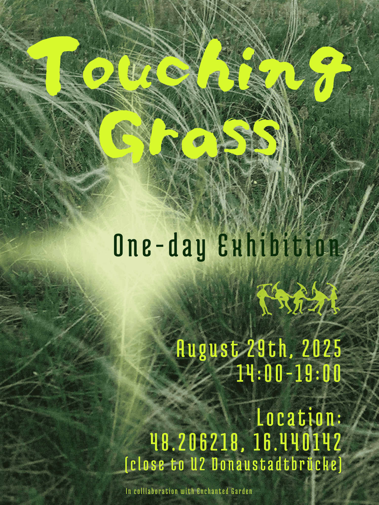 Touching Grass is a one-day exhibition exploring themes of sexuality and gender, isolation and connection, belonging and loneliness, and how these intersect with our relationship to the natural world. Artists will respond in diverse media, alongside a program of readings and performances. Together, we’ll lie in the grass, swim, and share space with each other and with nature. The community-based, non-hierarchical, feminist event will take place outdoors on August 29th, from 14:00–19:00 at Donauinsel, near Donaustadtbrücke (U2). The event is organized in collaboration with Enchanted Garden. More information on Instagram For questions or more information, please contact us at touching.grass.exhibition @gmail.com.