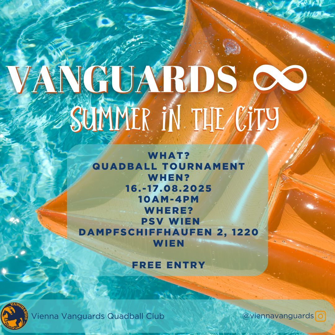 Der Wiener Quadballverein Sportclub Vienna Vanguards veranstaltet zum zweiten Mal ihr einzigartiges und spannendes Sportturnier. Begleitet von einem ausgiebigen Rahmenprogramm findet das Turnier “Vanguards Infinity” vom 16. bis 17. August 2025 auf der PSV Sportanlage in Wien statt. Das heurige Motto ist “Summer in the City". Über 120 Sportler:innen aus 13 Nationen finden sich dafür in Wien zusammen. ----- The Viennese quadball club Sportclub Vienna Vanguards is hosting its unique and exciting sports tournament for the second time. Accompanied by an extensive supporting program, the "Vanguards Infinity" tournament will take place from August 16 to 17, 2025, at the PSV sports facility in Vienna. This year's theme is "Summer in the City." Over 120 athletes from 13 nations will gather in Vienna for the event.