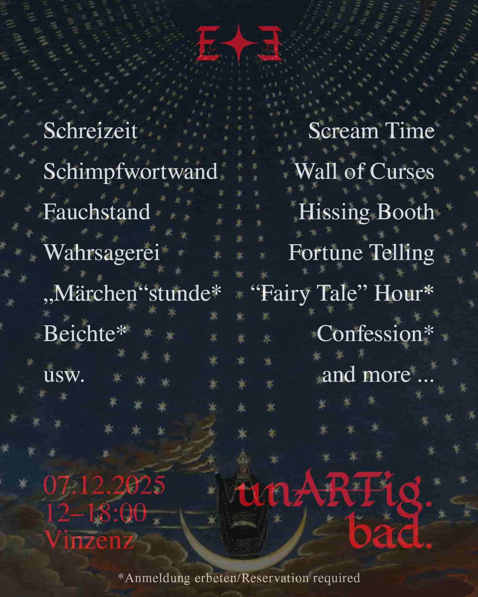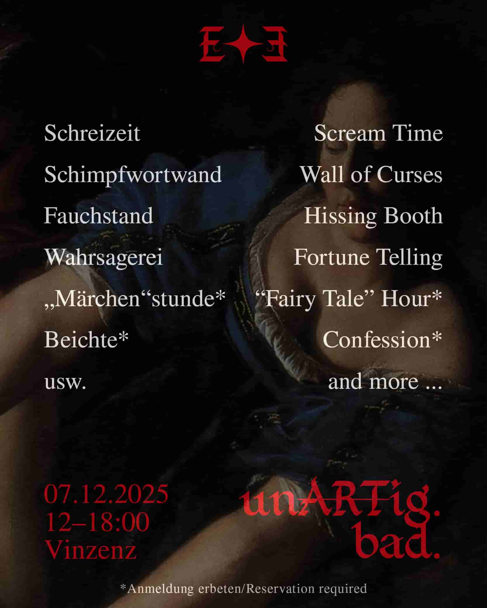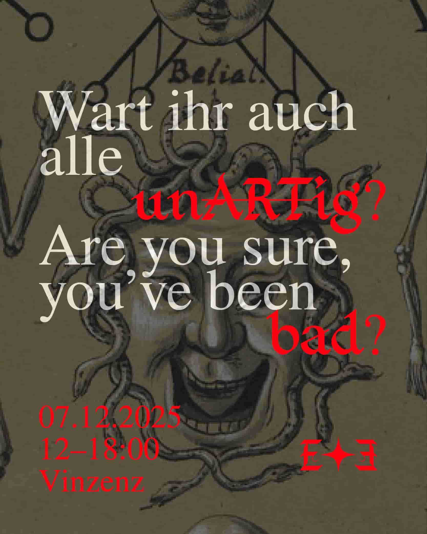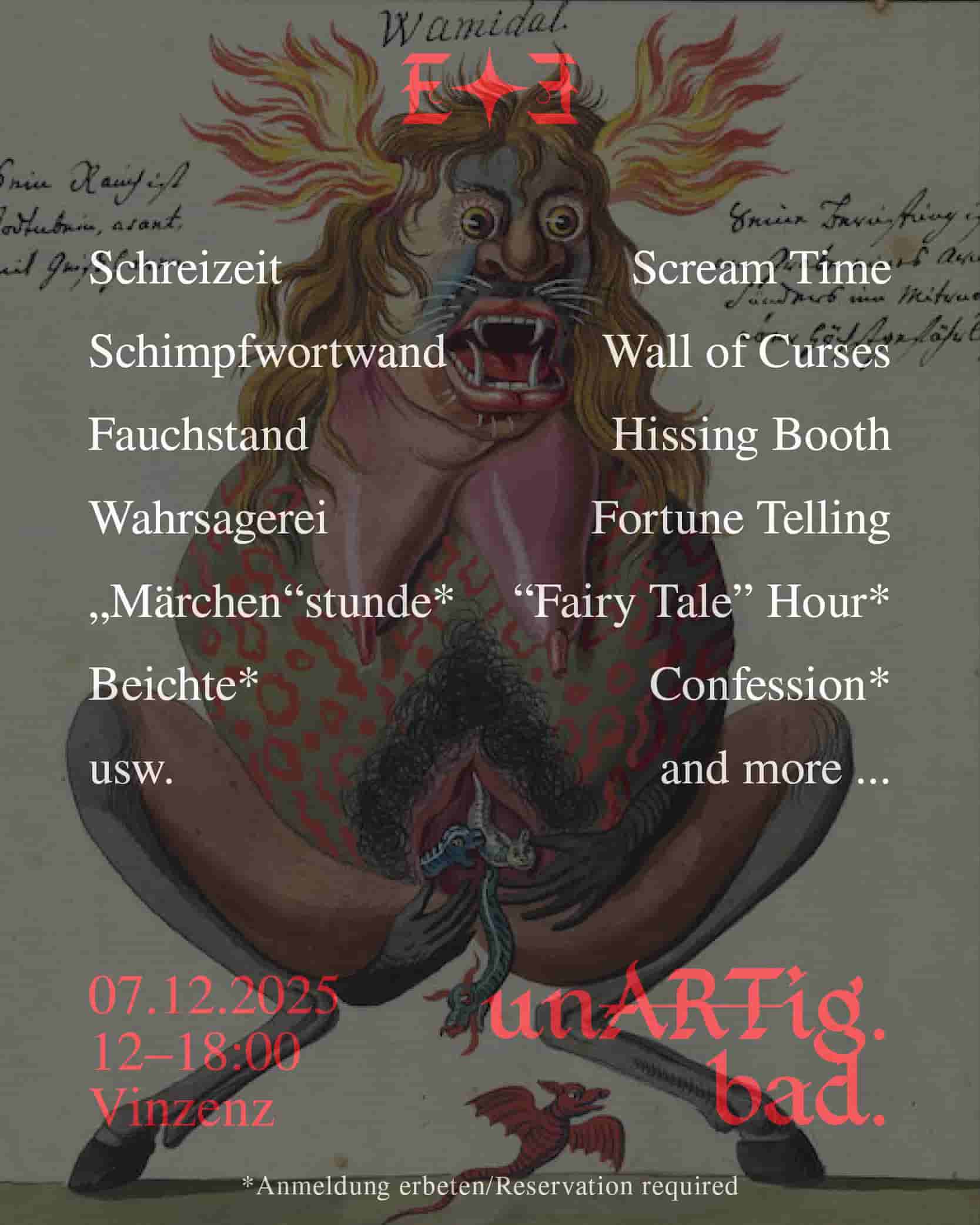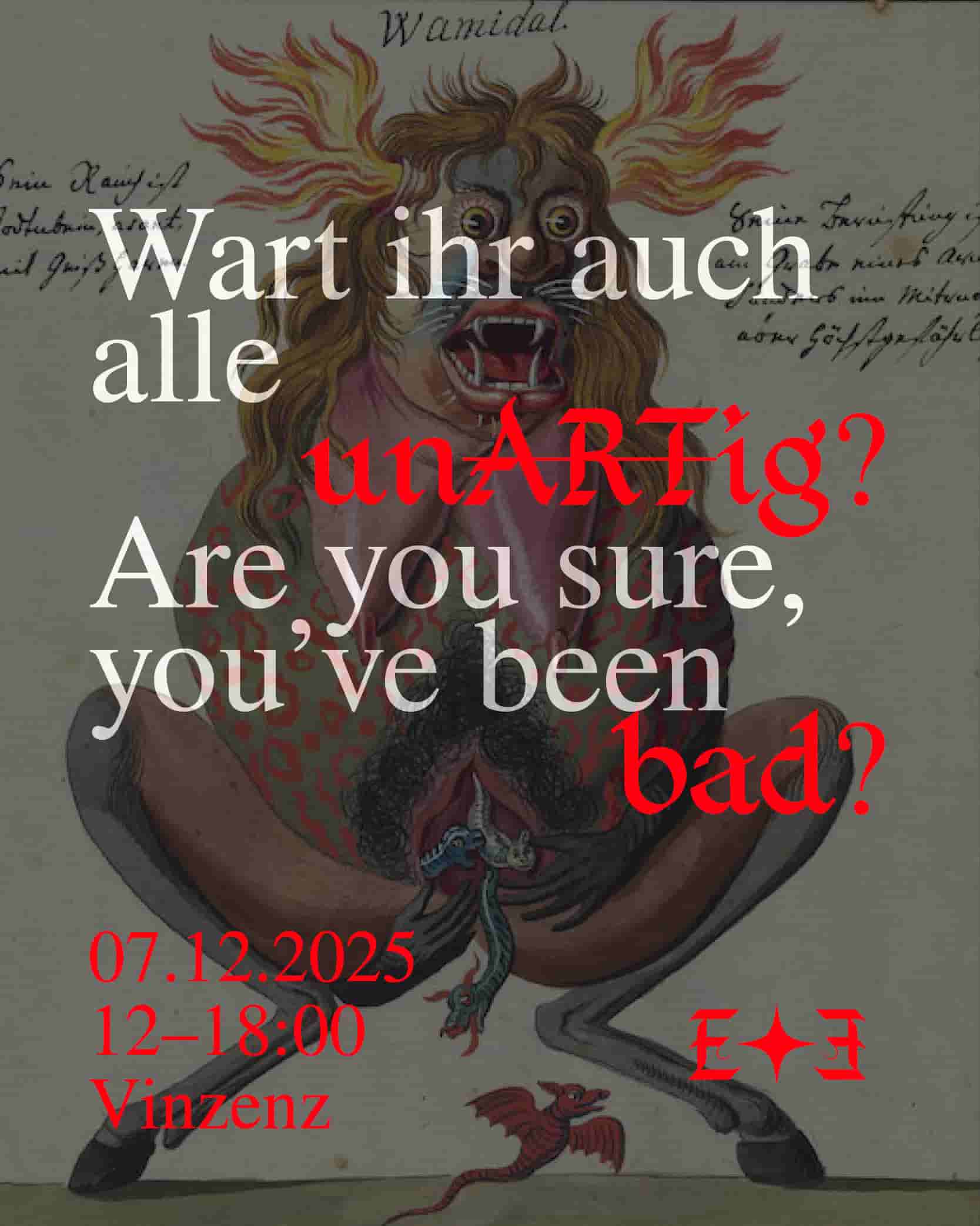 Wart ihr auch alle (un)ARTig? Are you sure you've been bad?A subversive-feminist day of action 7. Dezember 2025, 12–18:00VINZENZ, Vinzenzgasse 24 Free admission (partial reservation required) Program highlights: ● Fairy Tale Hour (reservation required via DM): The girl* with the red shoes Reading session with feminist reflections, followed by an open discussion ● Confession (reservation required via DM): Exchange about moments of lack of self-determination. Absolution comes with a sweet treat, penance with food for thought on “fasting” from misogynistic thoughts and patterns. Those who do not reserve a time slot with a confession ticket, can attend unstaffed station for quiet contemplation, with instructions for self-confessing. ● Fortune Telling ● Projection & Wall of Curses: An examination of language and how it shapes us Lip service, word definitions, and visitor contributions in dialogue ● Hissing Booth: Put on a bad face: photo booth that invites you not to smile Your angry (demonic) or proud face as a commentary against social expectations ● Purifying Screamtime: A collective act every hour on the hour ● Goodies as a reward for “naughty” behavior and more … We invite you to a humorous, feminist, and artistic experience that questions traditional notions of good behavior and social norms. Embedded within the nostalgic duality of St. Nicholas Day and Krampus Day, a space is created that invites reflection, participation, and silliness. The aim is to playfully examine internalized role models – especially those that limit FLINTA*, AFAB* and those identifying as women* in their self-determination. The action day is open to all interested parties and encourages self-reflection, exchange, and occasional disobedience.