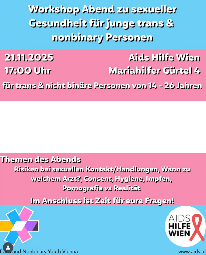 Workshop Abend zu sexueller Gesundheit für junge trans & nonbinary Personen 21.11.25 - 17:00 // Aids Hilfe Wien Mariahilfer Gürtel 4 - für trans und nicht binäre Personen von 14 bis 26 Jahren Themen des Abends: - Risiken bei sexuellen Kontakt/Handlungen - Wann zu welchem Arzt? - Consent - Hygiene - Impfen - Pornografie vs Realität Gesprächsrunde für Fragen am Ende des Workshops